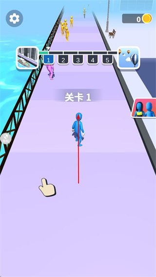 1、进入关卡1界面,跟随指引操控蓝色角色,沿赛道向前移动,靠近前方的其他角色。