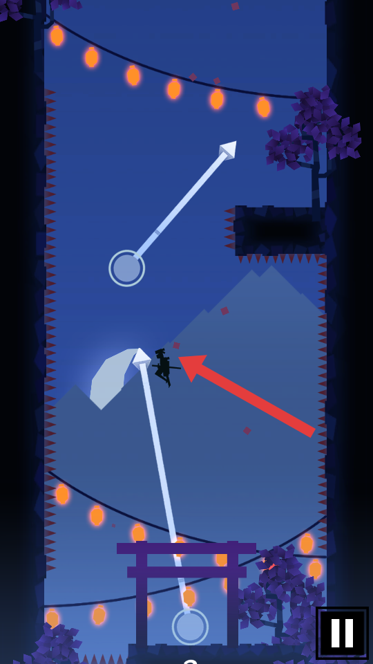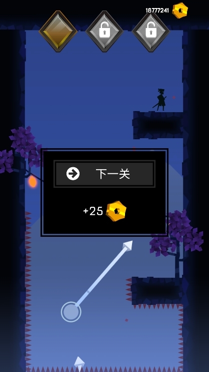 1、基础跳跃与瞄准操作:按住屏幕拖动手指确定跳跃方向与力度,释放手指后忍者跃起,跳至墙面或地面会自动粘住,需要瞄准无钉子的区域,避免触发了危险。