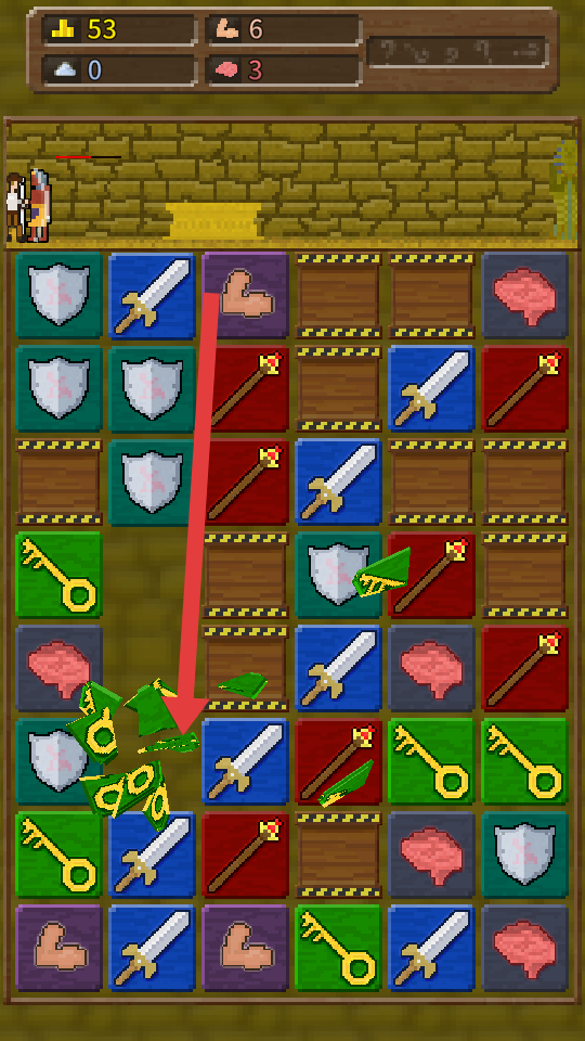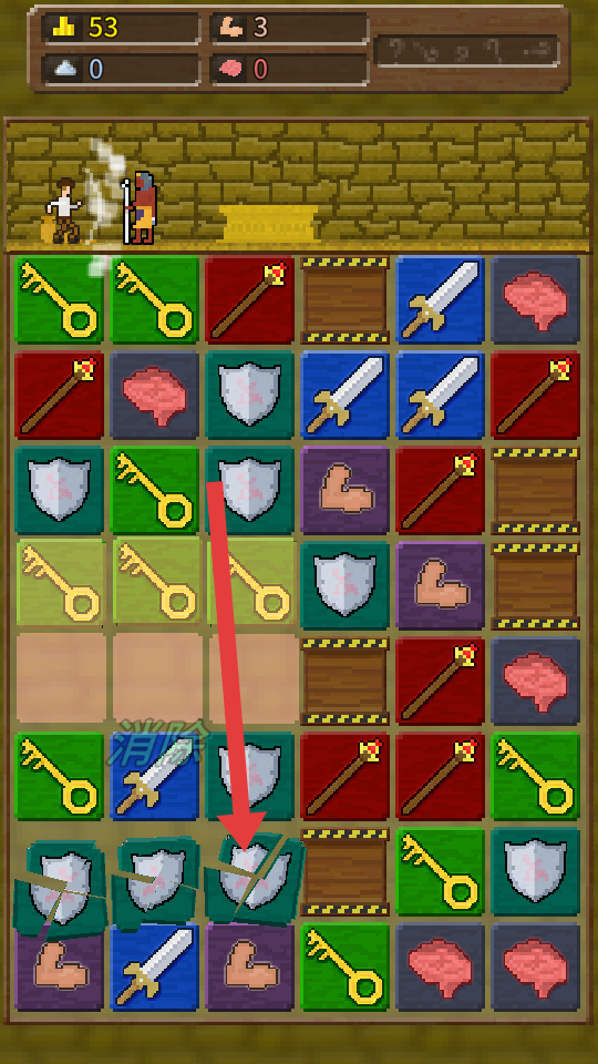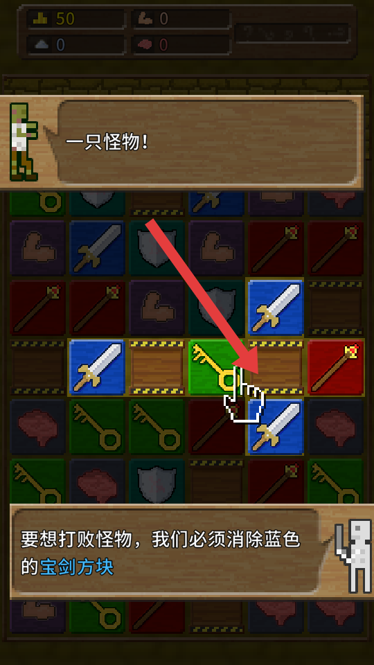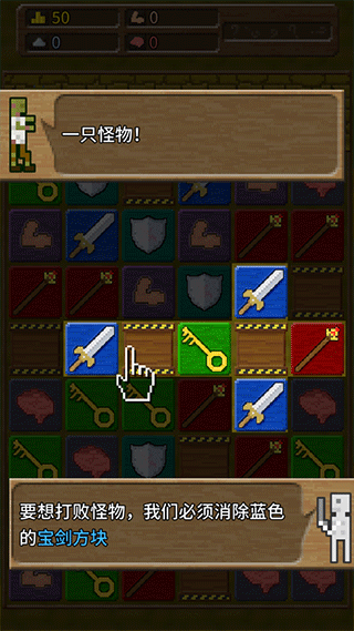 1、战斗时,优先消除绿色钥匙方块,它是解锁特殊区域或触发技能的关键,消除蓝色宝剑方块以打败怪物。