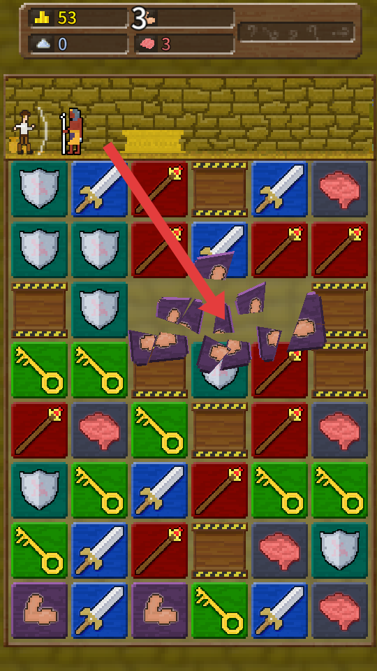 2、针对盾牌方块,通过消除其周围同类型方块,使其破碎,以此削弱敌人的防御,为攻击创造有利条件。
