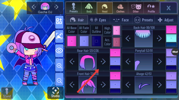 3、在头部编辑的Rear-Hair栏目,点击切换箭头,更换角色后脑部位的发型样式,打造独特角色造型。