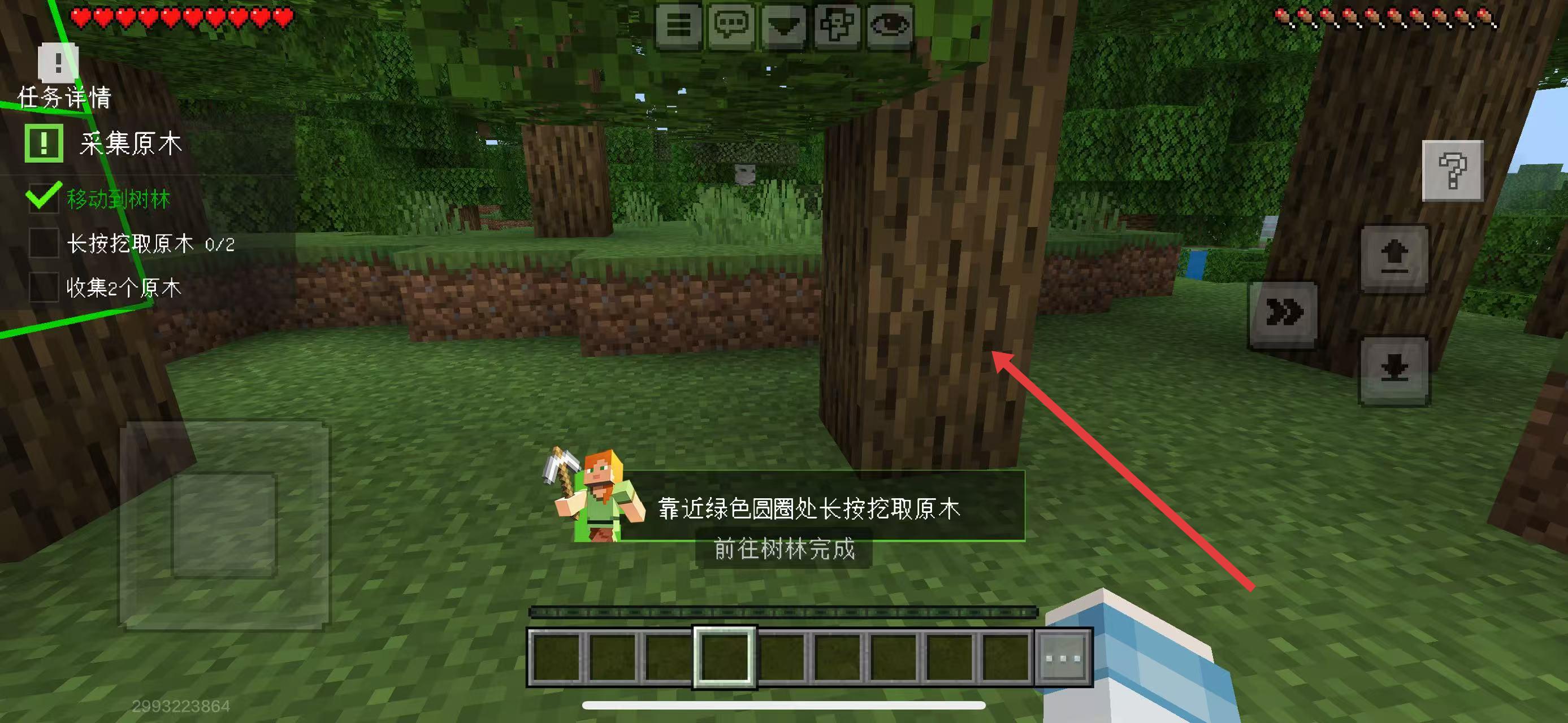 3、到达树林后,靠近树木,按提示长按挖取原木,需收集2个原木,完成长按挖取原木、收集2个原木任务环节。