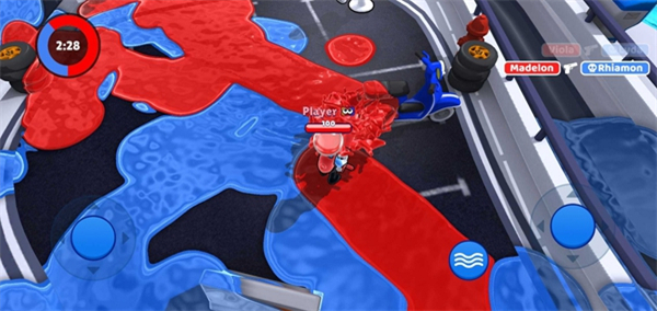 1、摇杆操控对战:通过左侧摇杆精准控制角色走位,右侧摇杆调整射击角度发射颜料,灵活躲避敌方攻击的同时,精准命中目标区域。
