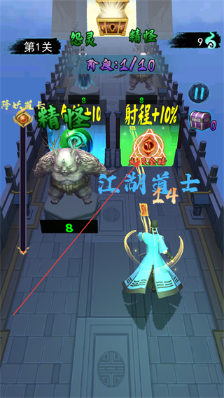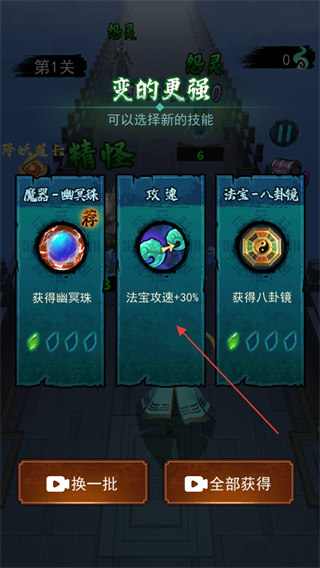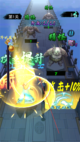 4、持续击败精怪,获取攻击+10%,射程+10%等增益,推进关卡进度。