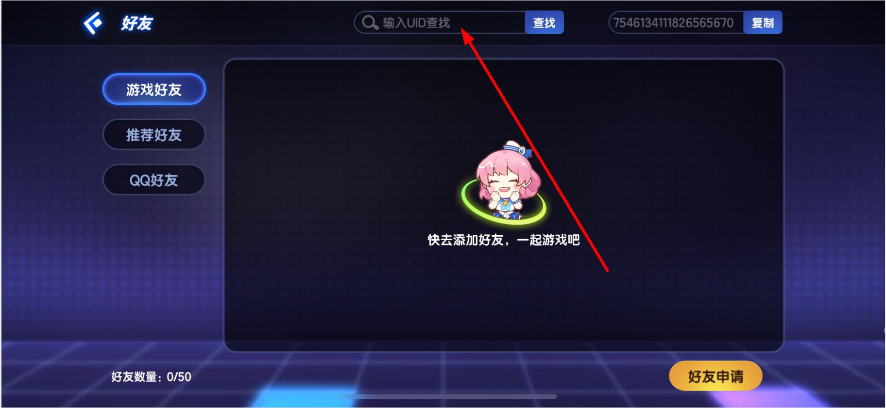 2、在好友页面,点击顶部的输入UID查找搜索框。