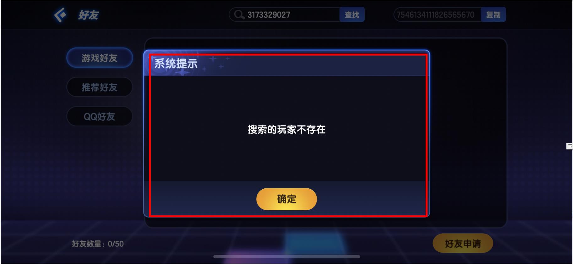 4、若搜索的玩家不存在,会弹出搜索的玩家不存在的系统提示,点击确定即可。