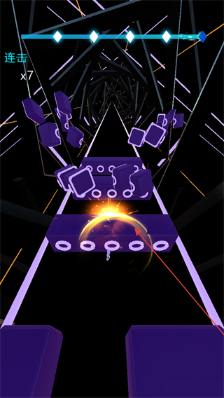 赛道中会随机出现加速、变向等特殊机制,配合节奏变化的方块,要求玩家在保持节拍感的同时快速调整操作,考验手眼协调能力。