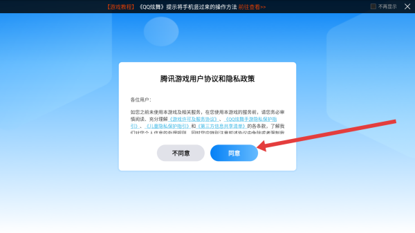 1、启动QQ炫舞手游时,弹出腾讯游戏用户协议和隐私政策弹窗,点击同意按钮,方可进入后续登录流程。