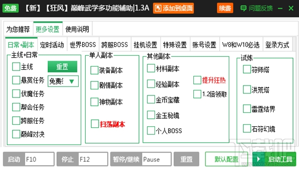 2、一键日常副本:悬赏任务、伏魔任务、帮会任务、跨服任务、巅峰任务;