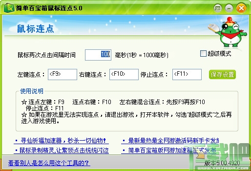 简单百宝箱鼠标连点5.0是所有游戏通用,鼠标自动点击器。经过测试最快速度每秒点1000次!哈哈!不管你是要奇迹连点器,龙族连点器还是千年连点器,该工具都可以帮您达成所愿,不用再费劲心思的查找啦!简单百宝箱鼠标连点通通满足你,而且该工具永久免费,绿色免安装.绝对的懒人必备工具!