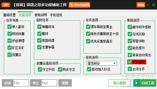 5、一键常规设置:邮件附件提取、在线奖励、荣誉领取、角色提升、装备自动卖出、主线任务;