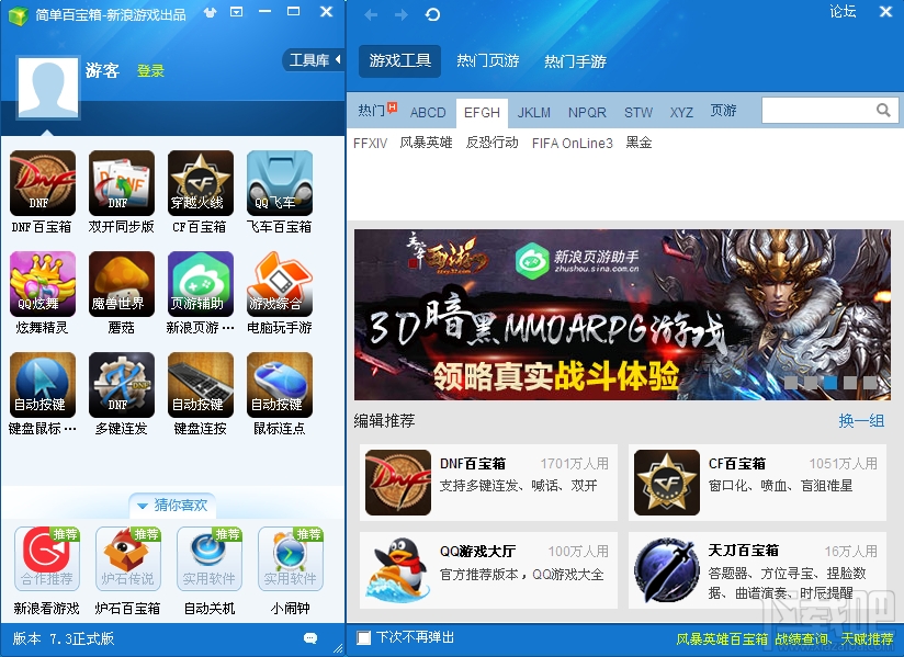 简单百宝箱是一个玩家随身工具箱,收录网游玩家最需要的游戏工具软件,简单百宝箱提供一键式的工具软件下载、管理服务,是一款免费、绿色的网游工具平台软件。