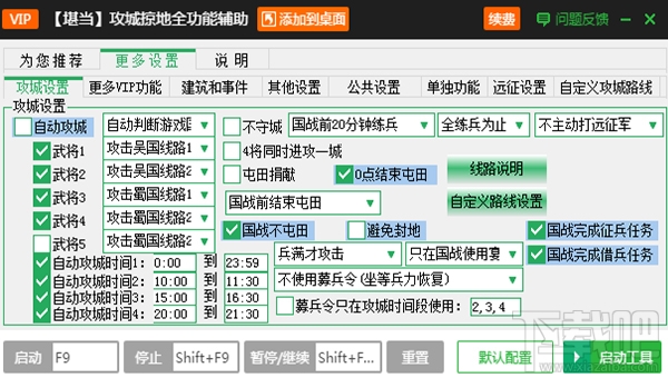 2、一键攻城设置:自动攻城、武将选择、时间设置、国战不屯田、借兵任务;