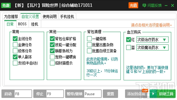 2、一键日常设置:主线任务、金牌任务、修炼任务、单人副本、支线、背包清理、血兰购买、背包仓库扩格、技能一键分配、躺着涨战力;