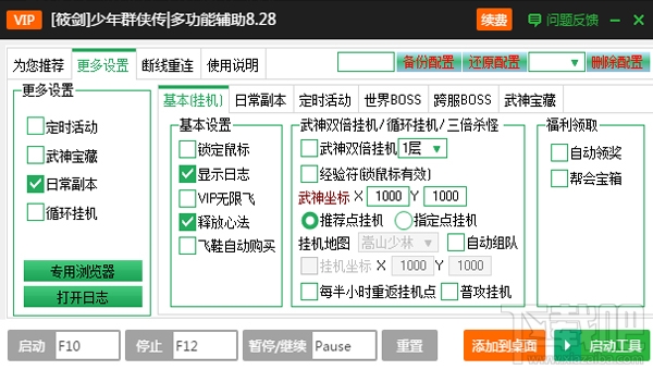 2、一键基本设置:定时活动、武神宝藏、日常副本、循环挂机、福利领取;