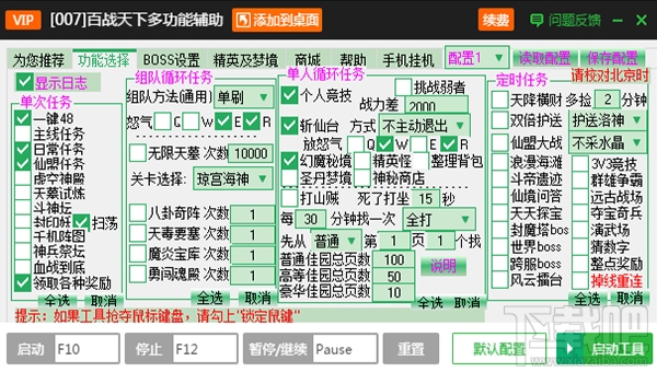 5、一键定时任务:天降横财、双倍护送、仙盟大战、浪漫海滩、斗帝遗迹、仙境问答、天天探宝、封魔塔BOSS、世界BOSS、跨服BOSS、风云擂台、3V3竞技、群雄争霸、远古战场、夺宝奇兵、演武场、猜数字、整点奖励、掉线重连;