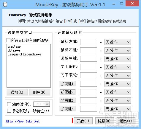 游戏鼠标改键助手MouseKey 1.1新增防止滚轮重复操作选项。根据部分用户需求及建议,单独出了个鼠标改键,方便不修改键盘只修改鼠标的用户。支持大多数主流的竞技游戏(魔兽DOTA/IMBA/真三/信长/忍村),当然还支持当下很火的LOL英雄联盟。
