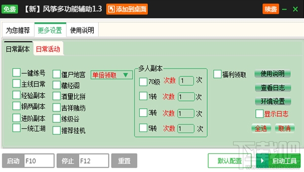 2、一键日常副本:一键练号、主线日常、经验副本、进阶副本、一统江湖、僵尸地牢、藏经阁、酒量比拼、吉祥赌坊、练级谷、推荐挂机、福利领取;