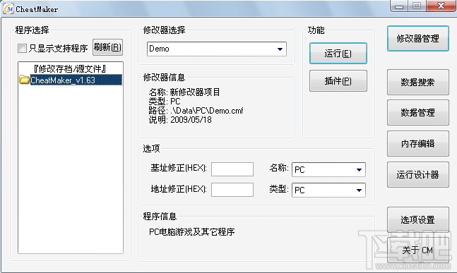 CM(简称)支持普通游戏修改器的大部分功能:数据搜索 数据修改 内存管理 地址管理...等等.而CM不仅仅是这样,CheatMaker可以制作基于任何程序的专用修改器 静态修改(文件修改) 动态修改(内存修改)皆可.当然也包括任何游戏!它不仅支持PC程序 还支持大多数的EMU数据修改.使用灵活强大的{支持程序}(PC/EMU动态修改)设定功能 能够固定的处理PC动态地址数据.CM是实际上是可以对任何类型数据进行操作的 因为它的最小单位可以支持数据位(bit) 使得操纵二进制数据成为可能.