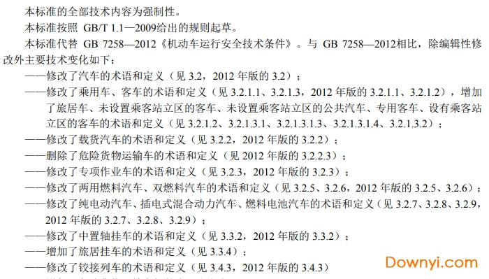本标准规定了机动车的整车及主要总成、安全防护装置等有关运行安全的基本技术要求,以及消防车、救护车、工程救险车和警车及残疾人专用汽车的附加要求。适用于在我国道路上行驶的所有机动车,但不适用于有轨电车及并非为在道路上行驶和使用而设计和制造、主要用于封闭道路和场所作业施工的轮式专用机械车。