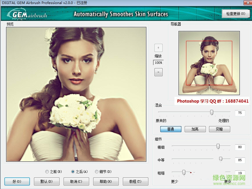 kodak磨皮滤镜是一款皮肤处理插件,省去我们自已处理照片很多步骤。一些人使用磨皮插件磨皮总感觉效果不好,其主要原因是对参数设置不当,从而造成磨皮效果不理想。同时,处理一幅图像,不仅只是使用磨皮插件,还需要photoshop里面多个命令结合完成。