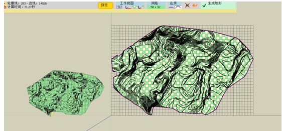 5、用顶视图模式显示 会看到虚线的网格覆盖整个山体 左侧为实体模型 右侧为放大视图的参考平面模式视图