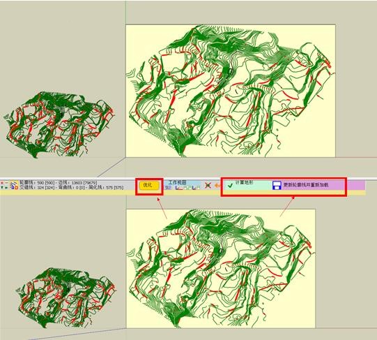 2、从左往右,先是以sketchup的正常透视视角单独观察原始空间等高线以及修复的红色状态区情况