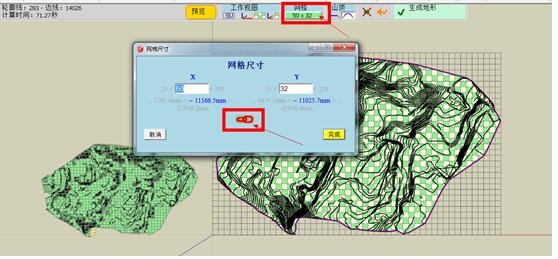 7、点击网格按钮 会进入的生成山体曲面的UV面数数量级的编辑模式(该插件计算UV数的表达用的是XY)默认的UV被锁定比例 也可以关闭锁红色锁按钮 输入自己想要的UV数量级 但是UV数量级越大 生成的山体曲面面数就越多 会造成生成的山体卡顿 不方便编辑 需要控制合理的UV数量级 而且UV的范围是根据登高线几个最远值来限定的 设置完成后 点击右下角