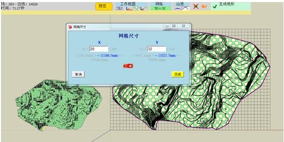 4、选择等高线方式时,它可在插件内部就对等高线进行各种优化处理,包括自动连接断开的小蓄口,手动连接断线可自动对线型优化,可即时预览生成三维地形,还可自由调整单位网格大小,以控制最终生成地形的精度。
