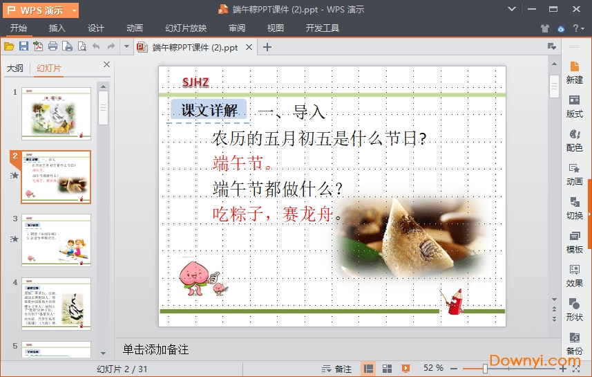 2、认识“端、粽、节、总、米、间、分、豆、肉、带、知、据、念”13个生字,正确美观地书写“午、节、叶、米、真、分、豆”7个汉字。
