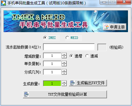 IMEIMEID手机串号数据生成:IMEIMEID码为15位,最后一位为校验码,企业用户申请时一般是给一个起始号和结束号段,在软件里面用户只需用起始号码的前面14位,最后一位自动生成。