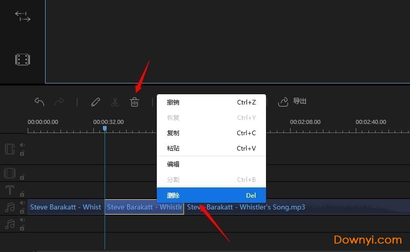 4、分割后的音乐如果是我们不需要的,可以在选中后点击工具栏的“删除”按键来删除,或者也可以在选中音频后,直接点击键盘上的“Delete”键来完成此操作。
