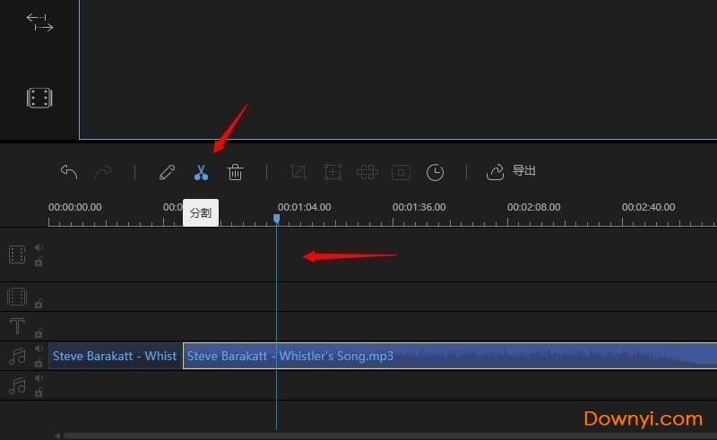 3、当音乐播放到你想切分的时间点时,暂停播放,点击工具栏的“分割”键可以将音乐分割开。当然,你也可以直接拉动时间轴至切分的时间点,分割音乐。