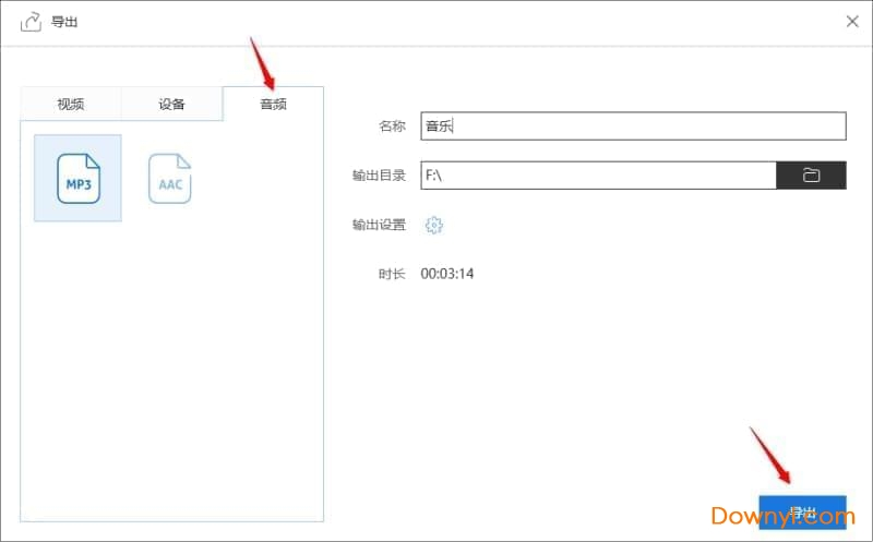 音乐剪辑完成并播放没有问题后,点击“导出”。在导出框内,依次选择“音频”“MP3”或者“AAC”后,点击“导出”即可。