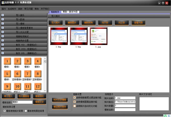 高影相册是一款专业的电子相册制作软件。软件简单易用,功能强大。具有专业的照片特效模板和转场特效模板。支持导入音乐,导入歌词、导入模模背景、导入片头片尾等功能,拥有多种风格的模板,可以把相册制作成vcd、svcd、dvd等视频格式,制作效果清晰,只需几步即可制作VCD,SVCD,DVD,高清晰的电子相册。能将数码照片转成VCD/SVCD/DVD/格式,简单易用,功能强大,是制作VCD/SVCD/DVD电子相册的最佳选择。