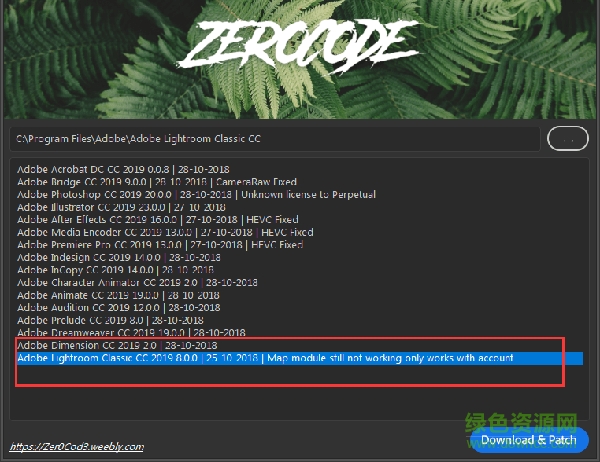 1、lightroom classic cc2019软件安装完成后,先不要运行软件,我们运行AdobeCC2019Zer0Cod3Patcher.exe正式补丁,如图所示,选择最后一项Lightroom Classic CC 2019选项,然后如果我们的安装路径没有修改,它会自动调整为安装路径