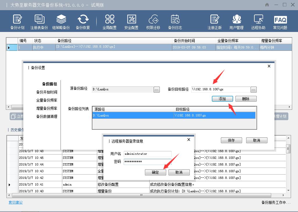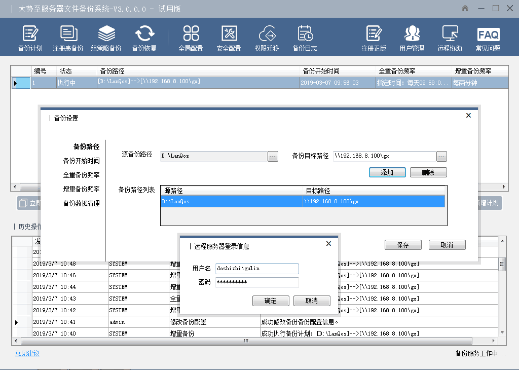 系统支持全量备份和增量备份,时刻监测备份源文件的变动情况,实现了实时同步备份整体数据文件和变动数据文件备份的功能;