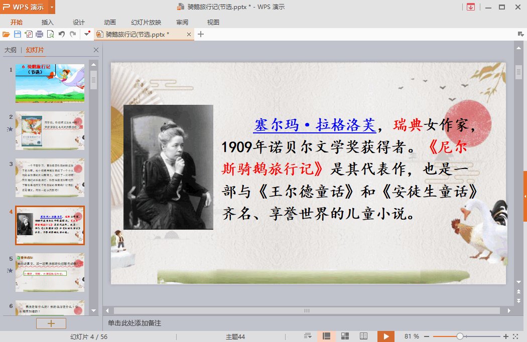 骑鹅旅行记节选ppt课件讲解很详细,而为你提供了6篇不同的ppt课件供老师和同学们使用。六年级下册语文第六课骑鹅旅行出自童话故事《尼尔斯骑鹅旅行记》,将带你进入一个不一样的童话王国。欢迎来体验!