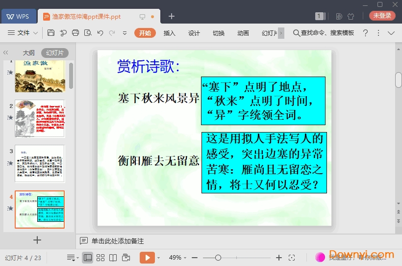 渔家傲秋思优秀课件为同学们学习故事中的韵味提供了引导的作用,无论是解读诗词还是讲解诗词大意这款ppt中都能为你限显示。软件使用简单方便,如果你想体验这款软件那就来体验吧!