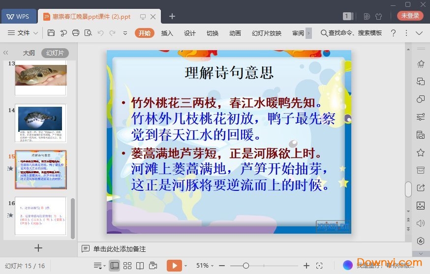 惠崇春江晚景最新ppt为同学们在学习这些诗词的时候能够有更加方便的使用体验,让玩家们在学习的时候有更加深刻的印象。课件内容比较适合自学,欢迎来体验!