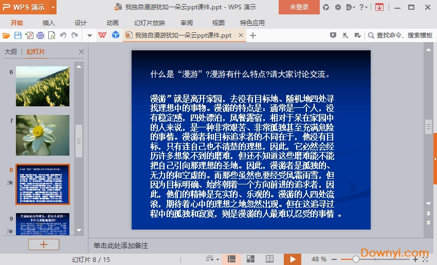 我孤独地漫游像一朵云ppt课件帮助同学们更好的学习这首古诗,为同学们在学习中使用更加方便的内容。课件中的内容不多,基本上就是讲意境和重点。