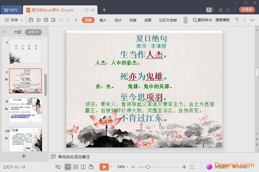 夏日绝句ppt课件为你提供讲解这首诗的具体内容,通过这款软件帮助你在学习的时候提供更多方便的内容,帮助你在学习的时候可以提供更多有用的内容。软件使用简单方便,如果你需要欢迎来体验!