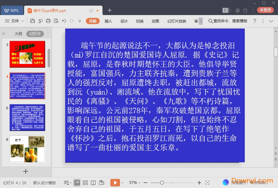 端午日免费课件帮助同学们更好的了解端午节的习俗,让同学们在学习课本知识的同时也要学习传统文化知识,让同学们的成长更加平衡。如果你需要欢迎来体验!