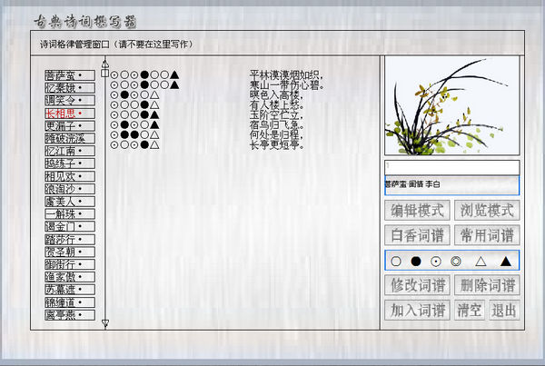 点击“古典诗词格律”菜单进入“古典诗词格律”窗体,这一功能是用来添加、删除、修改古典诗词的例诗、例词和相应的平仄符号,由于本软件开发者时间有限,目前仅放入少量的诗词例作和词牌,本功能让诗词爱好者自由添加扩充,在扩充数据时,请注意输入的格式要与原有的格式一致,并且使用本软件使用的平仄符号,其他符号本软件不能识别。本软件仅供业余诗词爱好者入门写作之用,不携带任何插件。本次升级后界面更友好,操作更简化,使用更方便,永久免费。