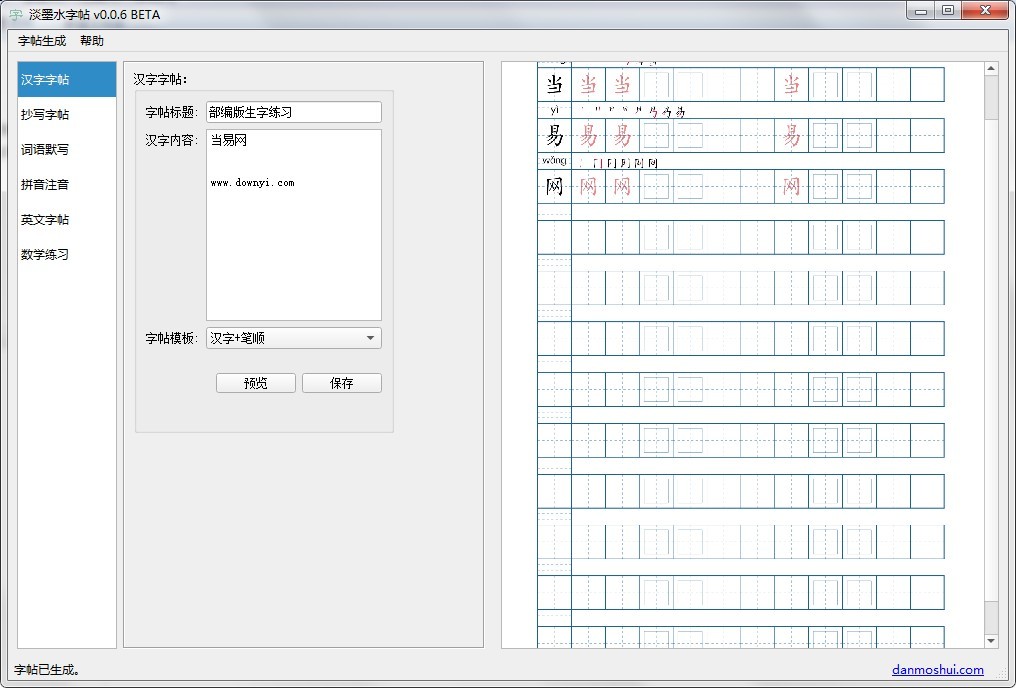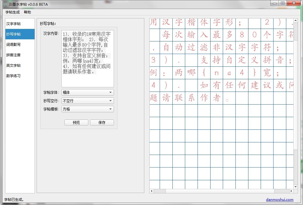淡墨水字帖是一个支持在线、微信小程序、pc、mac的字帖服务软件,它能够很方便的生成各种适合学龄前儿童、小学阶段学生的练字字帖、抄写字帖、词语默写、拼音注意、数学练习、英文字帖等内容。