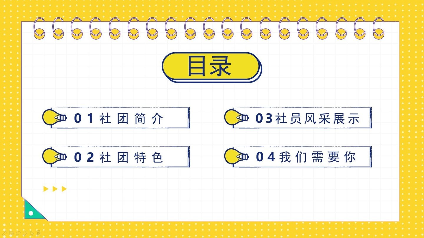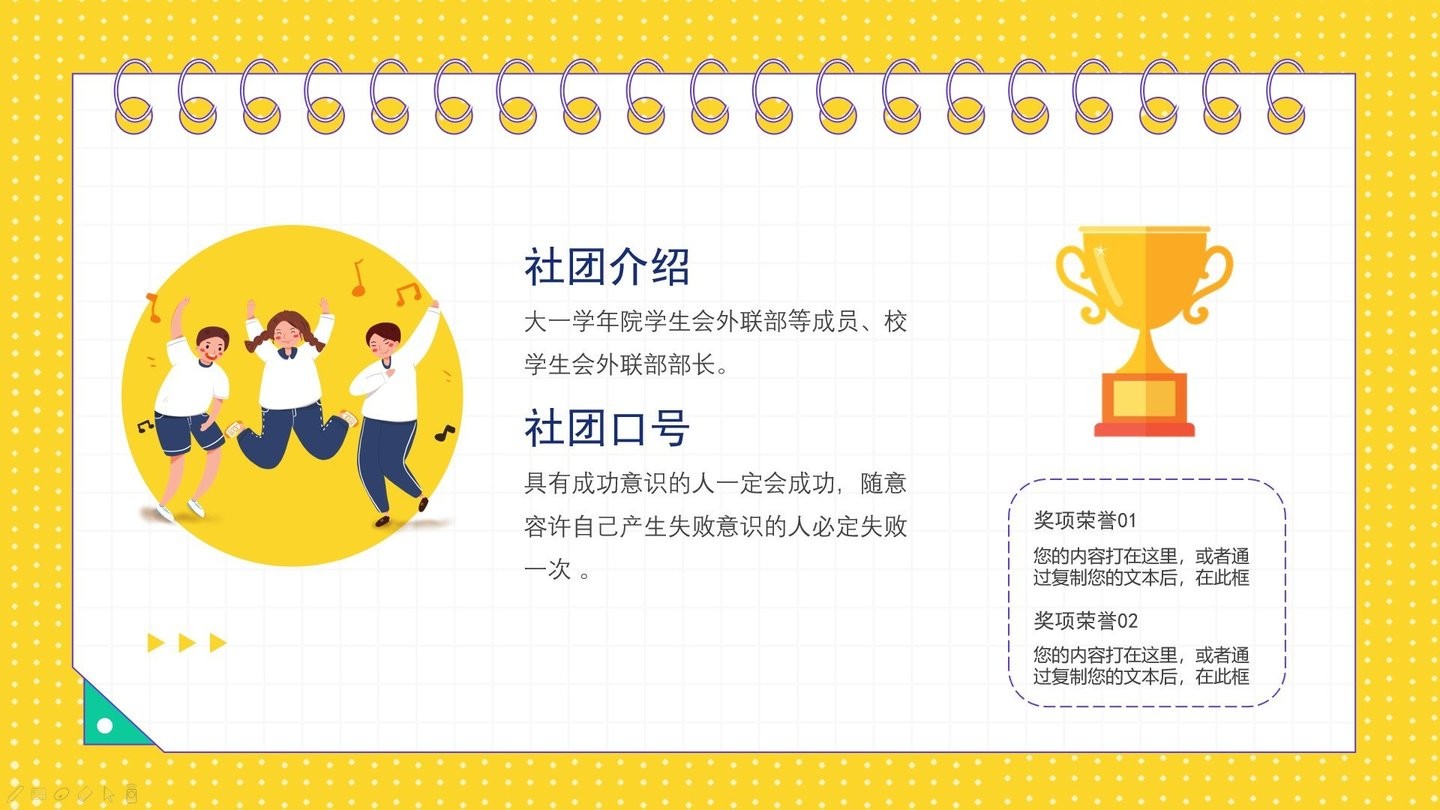社团招新ppt模板是专为大学生社团人员开发的ppt文档软件,可以帮助文案编写人员去更加便捷写出自己的招新内容,帮助自己的社团吸引更多的学弟学妹加入进来,特别适合大学社团进行招新活动。