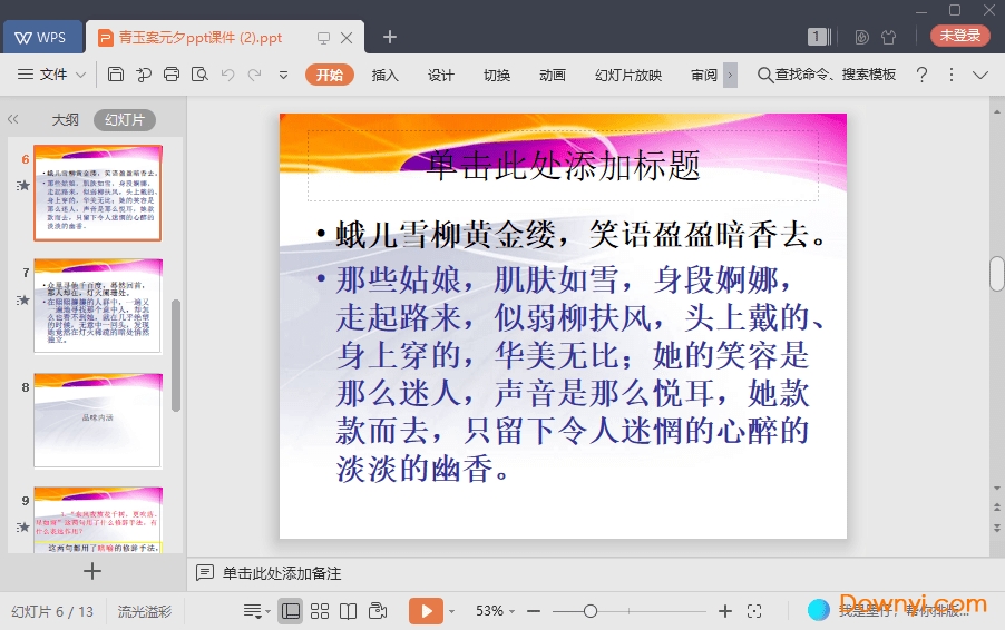 青玉案元夕ppt课件为通过描写元宵节中的聚会,通过诗人的视角来叙事。这首诗词采用烘托对比的手法将主人公脱颖而出,将其形象具体化。如果你需要欢迎来体验!