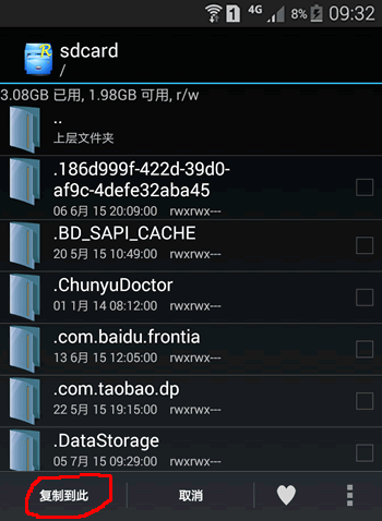然后点击三次顶部的“..”返回到根目录,再点击进入sdcard文件夹,并点击底部的“复制到此”按钮,如下图所示: