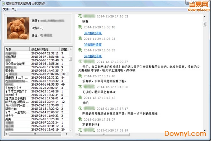 此时,我们就可以在楼月微信聊天记录导出恢复助手软件界面上查看所有安卓手机上的微信聊天记录了,查看时界面如下图所示: