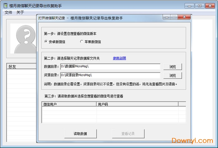 下载并打开“楼月微信聊天记录导出恢复助手”软件,微信版本设置为“安卓版微信”,数据目录及资源目录设置为之前导出的两个micromsg文件夹(两个文件夹的顺序不能错),然后点击“读取数据”按钮,再单击选择一个微信用户后点击“查看记录”按钮。